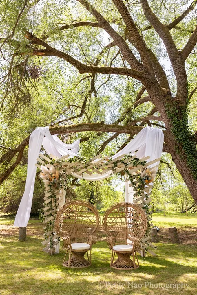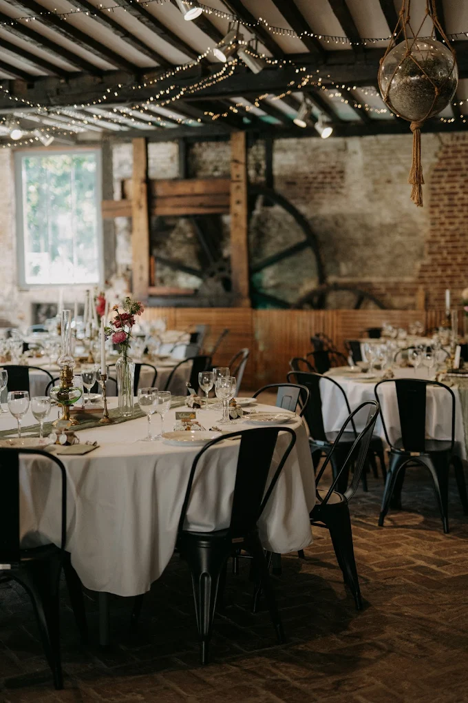 Avec son cours d’eau, ses arbres centenaires et son bâtiment de caractère, ce moulin offre un décor naturellement apaisant. L’ancienne bâtisse, restaurée avec soin, conserve son charme d’origine tout en proposant des espaces adaptés à la réception. L’ensemble crée une atmosphère douce, presque suspendue, parfaite pour un mariage à taille humaine et chaleureux.