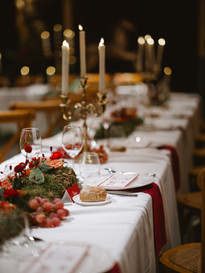 D&T's priority was to craft a deeply personal celebration with a strong focus on guest experience. From a welcome station featuring hot chocolate and marshmallows to warm the guests on a cold winter day to a generous buffet of delicacies, a French gastronomy menu, surprise entertainment (of course, the evening featured an impressive Lion Dance performance) and heartfelt speeches, no stone was left unturned to wow their guests and ensure they were comfortable. Inspired by the bride's winter wonderland vision and the venue itself, the design became quiet inspiration - enhancing without overpowering. Shades of red, subtle gold accents and greenery brought warmth and enchantment, and a carefully designed soundscape accompanied guests throughout the evening.